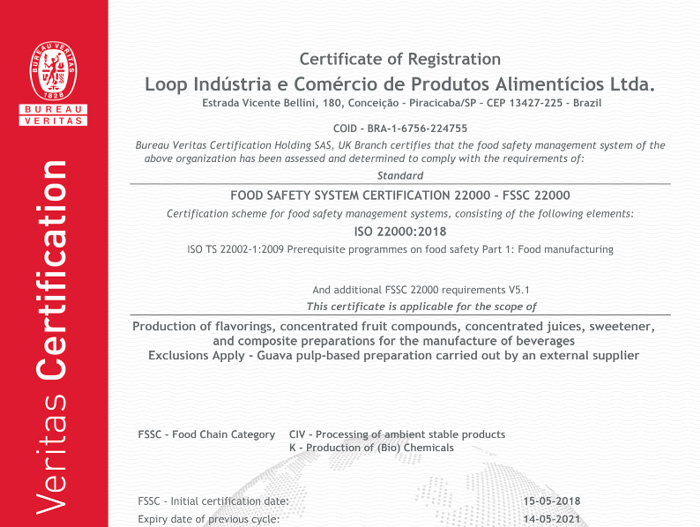 A Norma FSSC - Foundation Food Safety Certification - atesta que a Loop comprova o seu compromisso com a qualidade e segurança de seus produtos. E mais:
